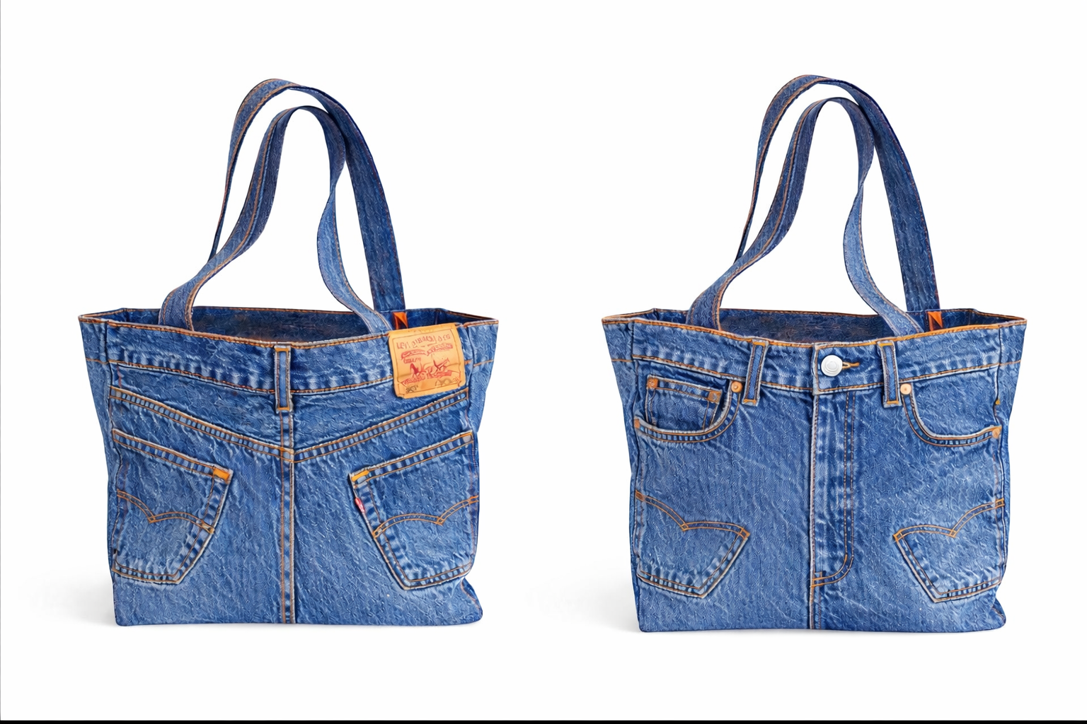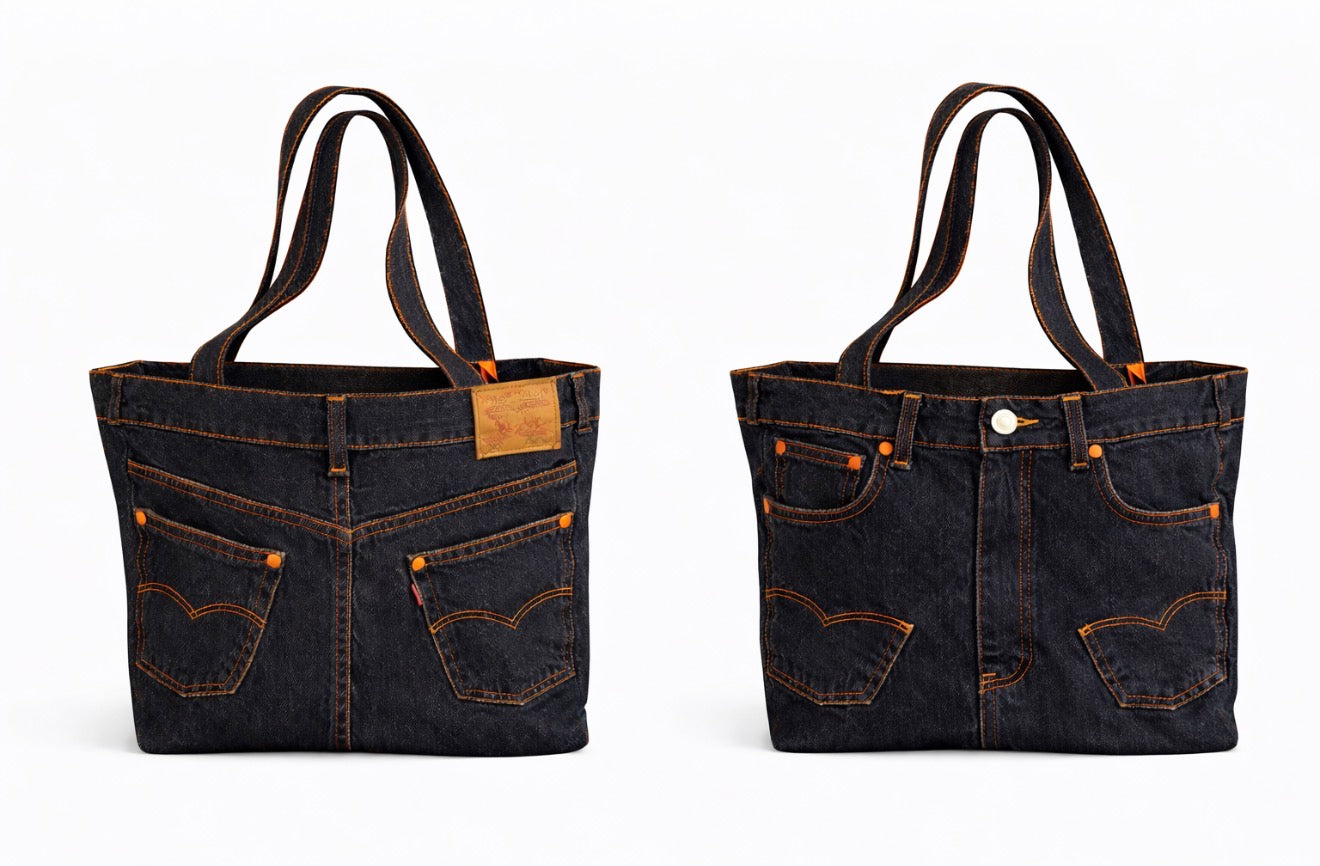 Rich dark denim finished with bold contrast stitching and a signature orange-lined interior